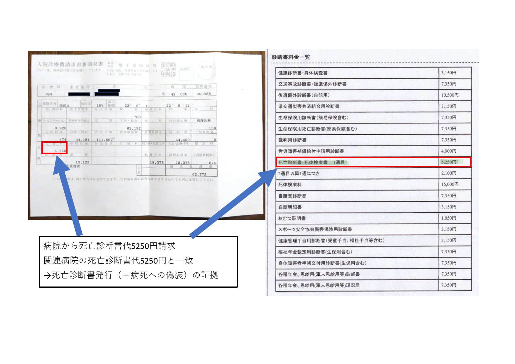 - 2010年9月分請求書の私費・文書料5250円が、系列病院の死亡診断書料に一致。