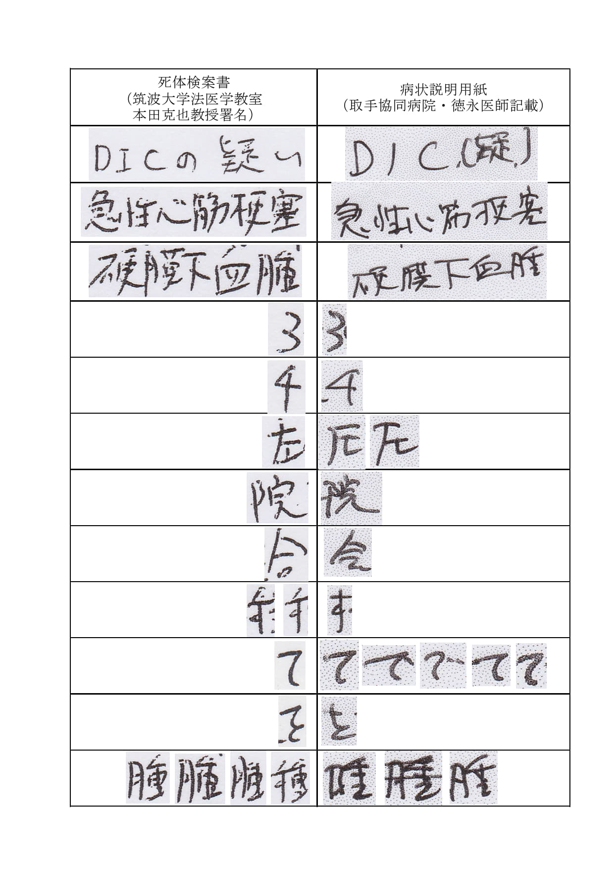 - 筆跡比較 死体検案書(筑波大学法医学教室・本田克也教授の署名入り)と取手協同病院・循環器内科長・徳永毅医師の筆跡を比較します。