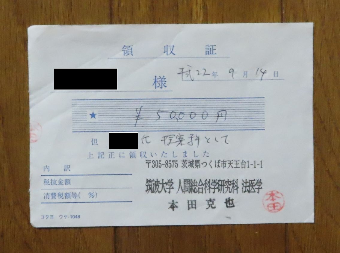 - 司法解剖代領収証の捏造 沢村紀行刑事が立て替えて法医学・本田克也教授に支払った際に受け取ったとのことです。これと引き換えに私たち遺族は5万円を支払いました。